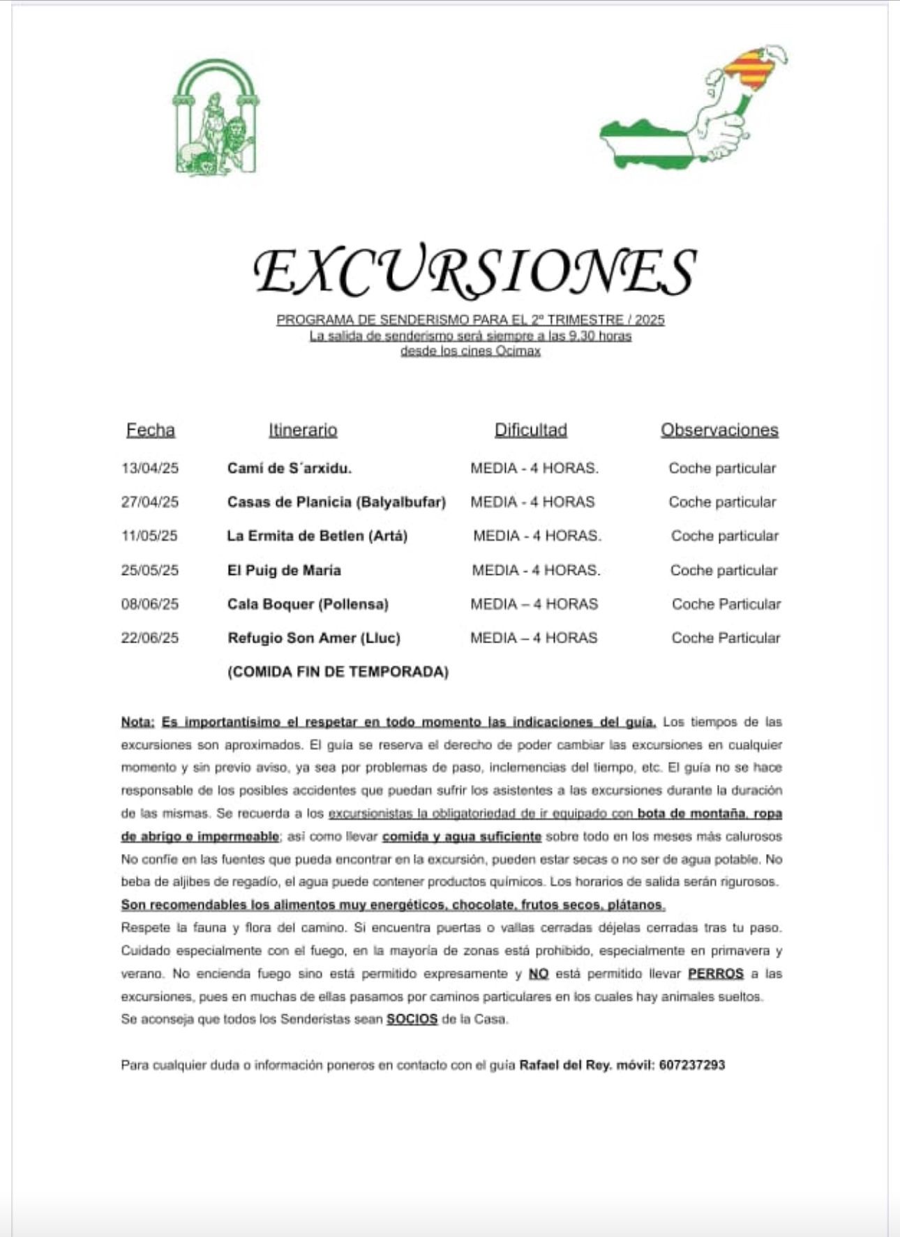 Nota: Es importantísimo el respetar en todo momento las indicaciones del guía. Los tiempos de las excursiones son aproximados. El guía se reserva el derecho de poder cambiar las excursiones en cualquier momento y sin previo aviso, ya sea por problemas de paso, inclemencias del tiempo, etc. El guía no se hace responsable de los posibles accidentes que puedan sufrir los asistentes a las excursiones durante la duración de las mismas. Se recuerda a los excursionistas la obligatoriedad de ir equipado con bota de montaña, ropa de abrigo e impermeable; así como llevar comida y agua suficiente sobre todo en los meses más calurosos No confíe en las fuentes que pueda encontrar en la excursión, pueden estar secas o no ser de agua potable. No beba de aljibes de regadío, el agua puede contener productos químicos. Los horarios de salida serán rigurosos.
